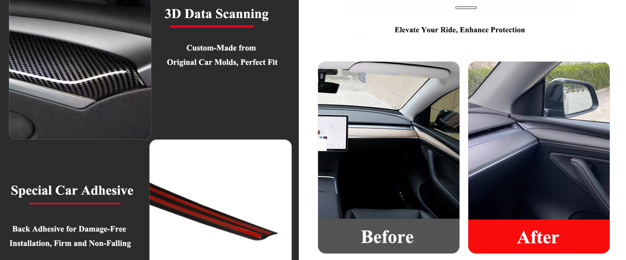 - Easy installation: Compared to the time it takes to install Vinyl Wrap on the market, we make it many times easier than they do, just peel off the tape cover, and place it over your dashboard, Then it's done.