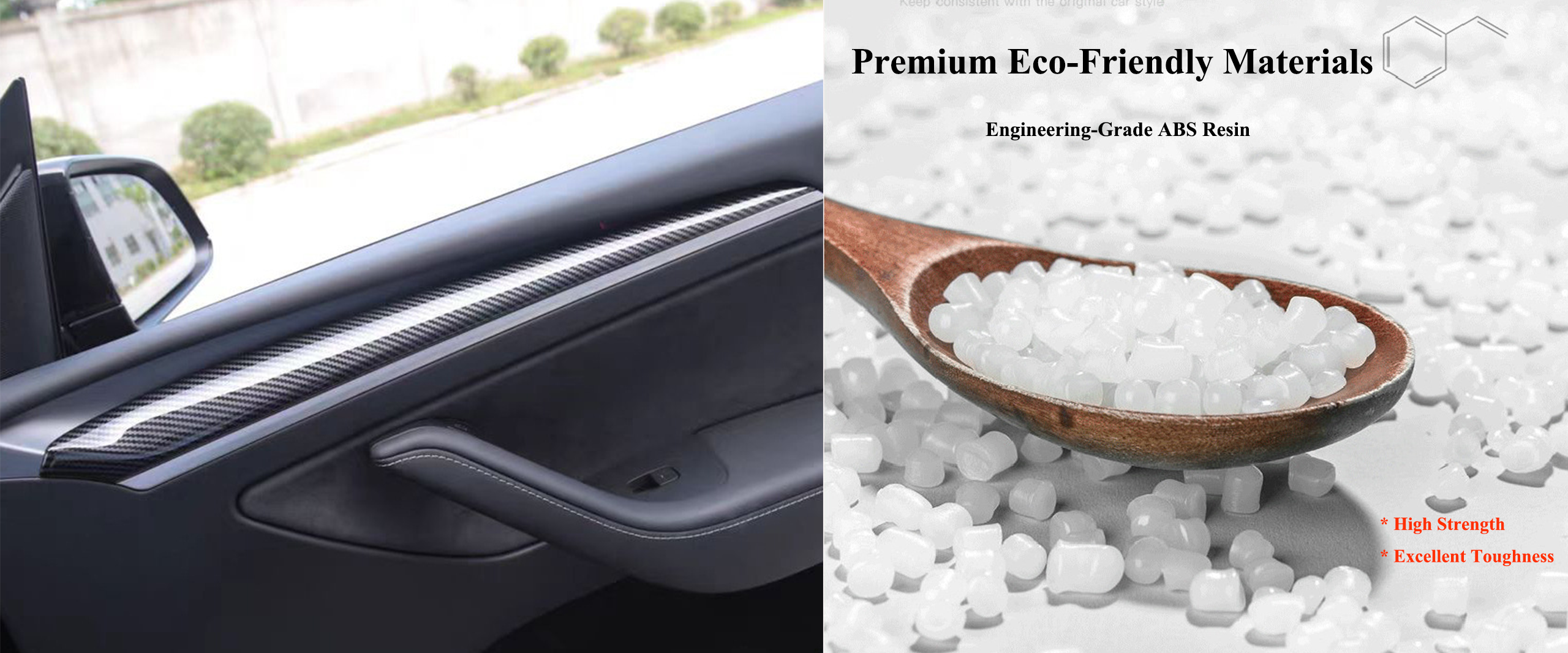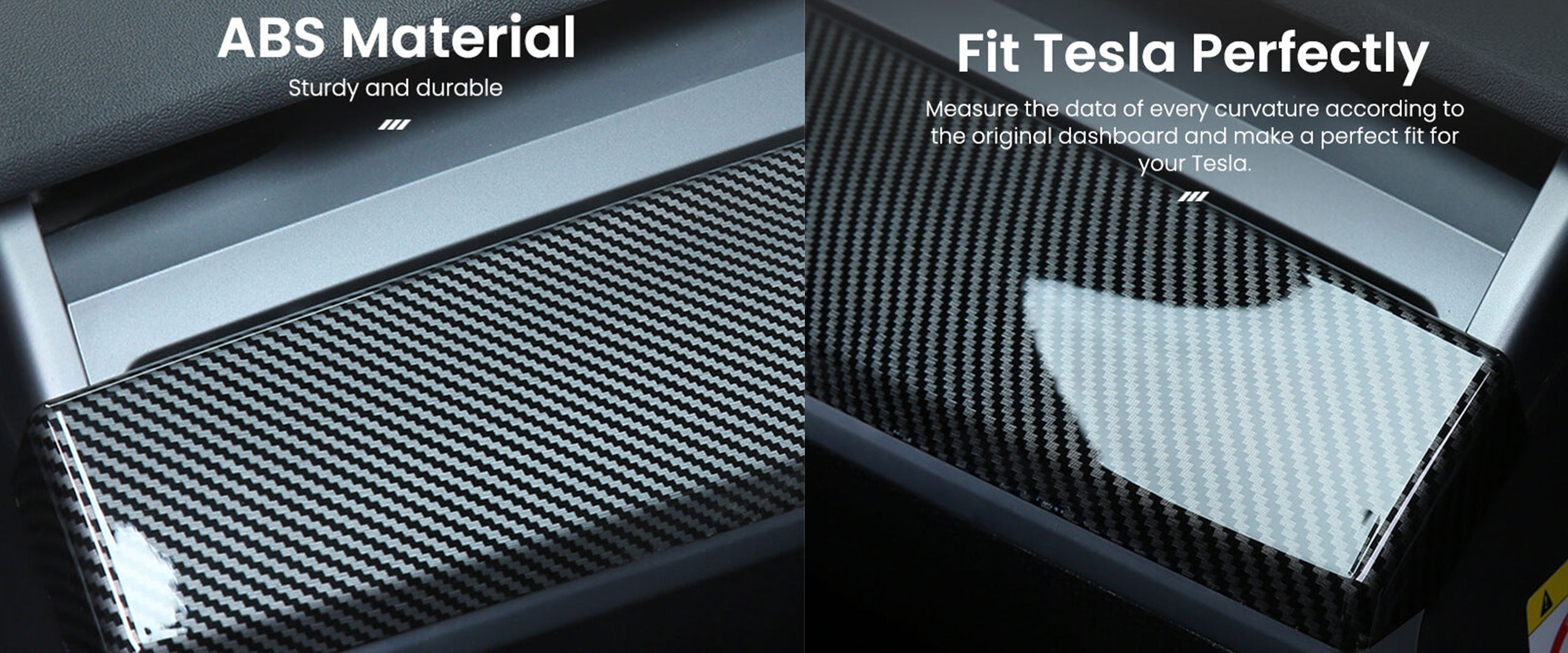 Elevate your Tesla's interior with the ElecMod Tesla ABS Carbon Fiber dashboard cap and front door panel cover, providing a blend of sportiness and luxury. Designed to perfectly fit all Tesla model 3 and model y, it offers effective protection for your dashboard's and front door delicate surface, guarding it against scratches.