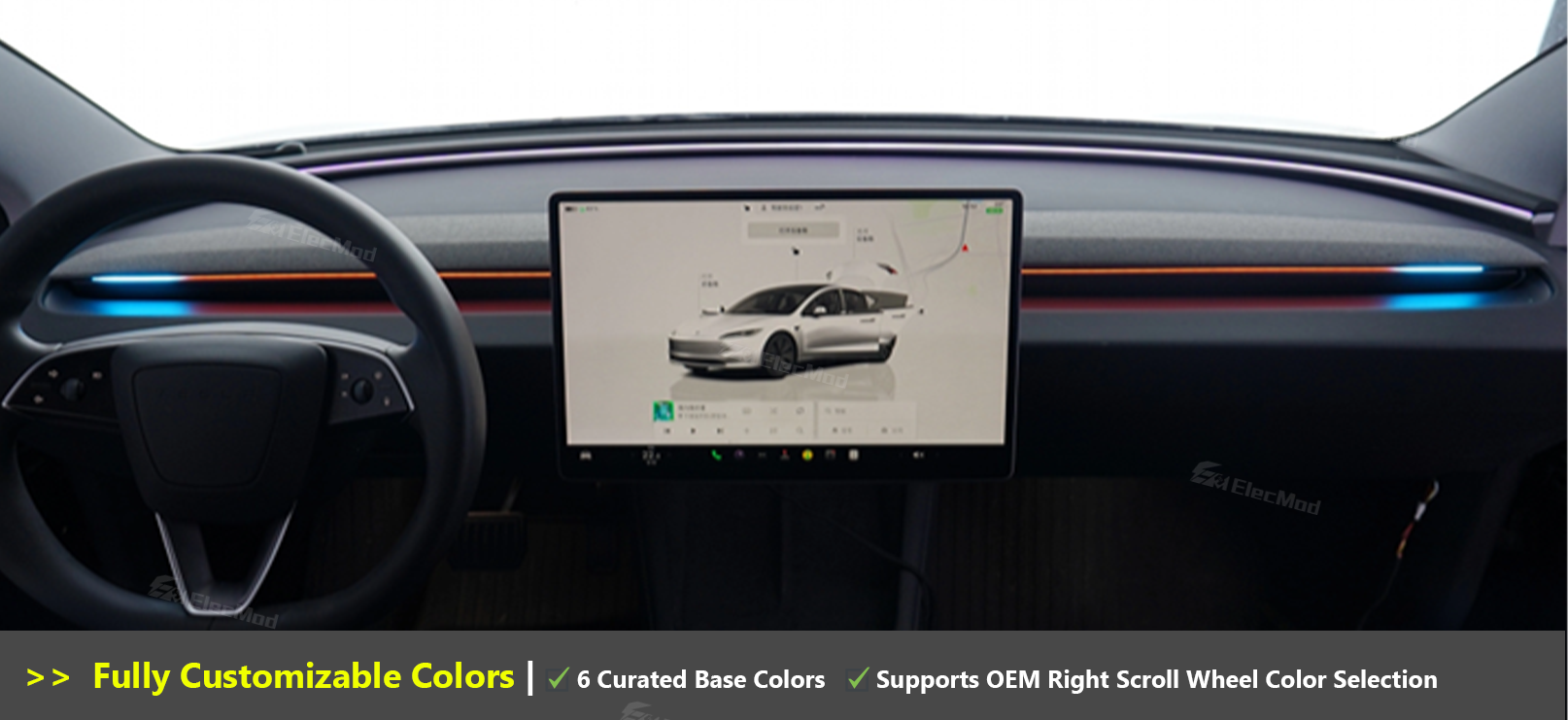 Choose from six built-in color modes for alert lighting, all adjustable via the original Tesla right scroll wheel. -