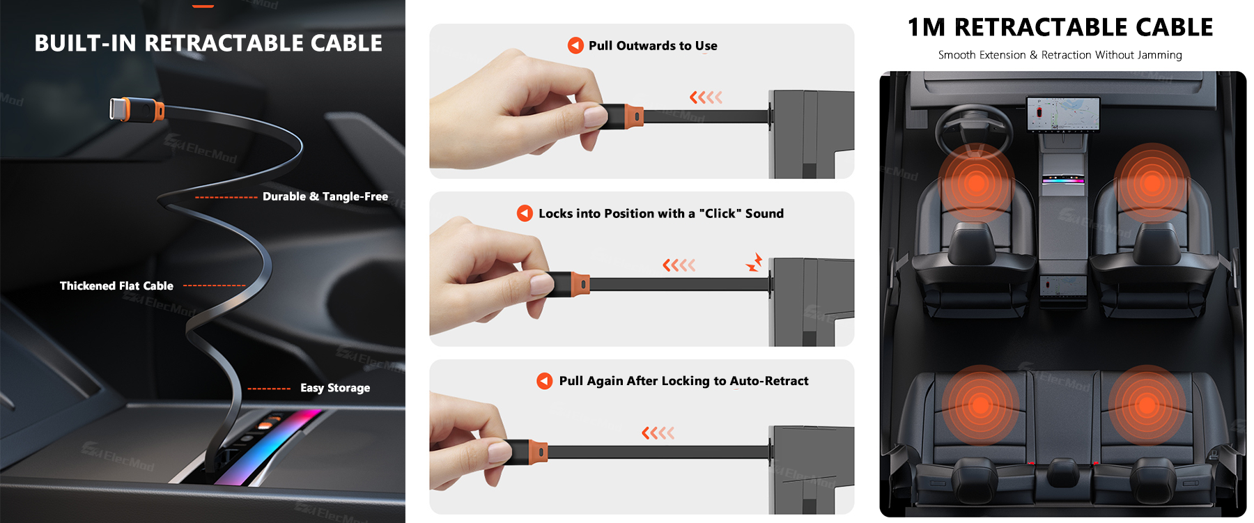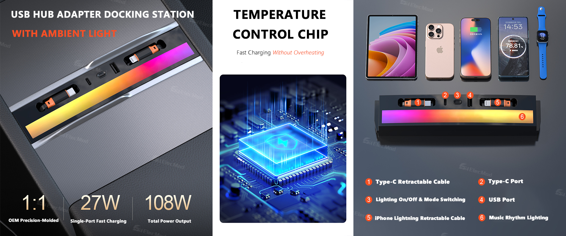 - Easy to Install: No need to disassemble or damage the center console. ElecMod docking station does not interfere with the use of the center switch and storage box. Simple installation and seamless integration with the center console. Does not take up space in the armrest box.